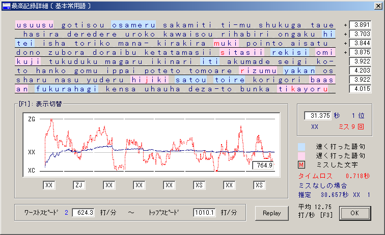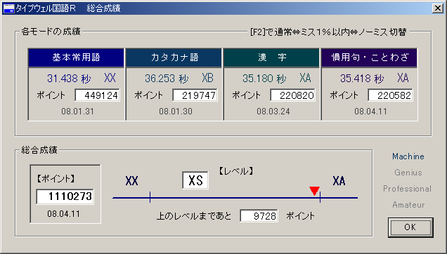 金曜日といえばGANGAS記録送信〆切日!! なんてことはすっかり忘れてたのですが、某C様との会話で思い出しました。 先日のリーチ状態から全く進んでいないTWR。 とりあえず22時頃から申し訳程度にぽちぽち打ってみるけど更新の気配なし\(^o^)/ 漢字数回、カタカナ数回と繰り返した末、あまりの不調っぷりに更新は完全にあきらめて 気まぐれで1ヶ月ぶり(!)に慣用句を起動。 ・・・したら1発で来ちゃったあああああ!! (なんかそんなんばっか>< 35.747[XA]→35.418[XA]! 全然たいしたことはない更新ですが、「あの状態」から脱するは十分すぎました。 ついに総合XS達成!!おつっしたーー!(? 結局XA→XSは2ヶ月半くらいかかったのかな? 1ヶ月以内に…とか言ってたのに途中から勢い失いすぎでしたね>< 今はそれなりにやる気がある時期なのでこのまま地味にがんばりますっ! 無謀だとわかっていても・・・Zがほしい・・・。 記録は23時過ぎに送りましたが、ちゃんと滑り込めているのでしょうかね!? おちょこ終了のお知らせ