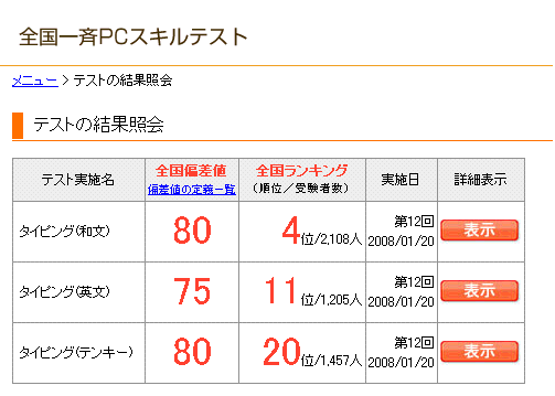 とゆーわけで、しつこい!?ですが はたらこねっと全国一斉PCスキルテストをやってみました第4弾くらいです>< 和文 入力文字数(2分間) 351 (前回315 前々回321 前々々回284) 1分あたりの文字数 175 (前回157 前々回160 前々々回141) 正解文字数 350 (前回315 前々回321 前々々回283) 英文 入力単語数(2分間) 110 (前回113 前々回118 前々々回118) 1分あたりの単語数 54 (前回56 前々回58 前々々回58) 正解単語数 109 (前回112 前々回116 前々々回117) テンキー 入力文字数(2分間) 437 (前回409 前々回412 前々々回393) 1分あたりの文字数 215 (前回200 前々回202 前々々回192) 正解文字数 430 (前回400 前々回405 前々々回385) おーおおお!? 和文とテンキーがかなーり伸びたらしいですよ! 和文は確かになんとなく打ちやすい文章が多かった気がします。 テンキーは「/」「-」にちょっと慣れてきたかなー。 英文はどんどん退化してる\(^o^)/オワタ ろんどんふるあと1歩