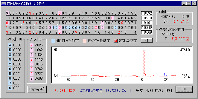 TWの記録更新日で気付きましたが、昨日は07.07.07だったんですね。 ちなみに07:07:07には夢の中でした。 ぺこらっくですこんばんわ。 昨日の予告通り、今日はばっちり不調でしたよ。(えふに) 指の痛さに現実逃避してTWオリジナルの封印を解いてしまいました。 成績ひどすぎるので話題にしないようにしていたのですがね>< 数字と大小文字混在をさりげなく更新しました。 数字はSE→SCに。大小文字は・・・アッー! まあ私にはオリジナルよりもっと他にやるべきことがありすぎるので これからも滅多にやらないことでしょう><(数字はやるかもですが) あーあと憲法も絶対やりませんよ! 長時間打つのはかなり苦手項目ですので。しかも漢字読めないし。 silentやばばー!たのしー! ところどころ衰えてるので修復したいですね。 でもぶっこみですごい罪悪感を感じるので部屋選びが困難orz おまけ。 M7きたこれΣΣ つい最近知ったのですが、ZZのさらに上がM1~M9らしいです。 ・・・まあお察しいただける通りバグなわけですが、 4行目のいかにも青いところで急にPCがガコガコ言い出して(多分ウイルス対策ソフトのせい)、 ふりーず→一気消えのコンボでこんなことに。 ついでに思い出した同類ネタ置いておきますね。 (^ω^;)・・・ 単純計算しても1位が38709.7なんですけど。 非現実的すぎて想像がつきませんよ。 (と思って計算機叩いたら1秒間に645打でした。) こっちのは5,6年前に使ってた旧バージョンの記録で、今は封印してます。 (というかこれじゃ使い物にならn 今日もいまいち>┼○バタッ