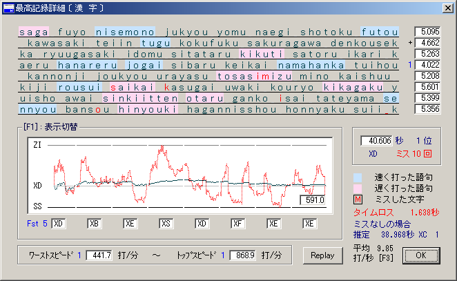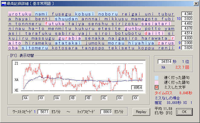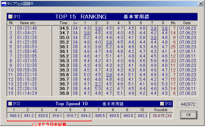 とゆーか漢字しかやってませんでした>< そのお陰でなんとなくコツが掴めてきたのか、 今までたまーに出る程度だったXFがかなりの確率で出るように。 (といってもEsc回数が凄まじいですが) 漢字は読めないの多いけど、読めるとこは加速しやすいですね。 ひたすら打ちまくってたらXD出ました ![]() 43.6[XE]からまるまる3秒の更新。 ワースピもトプスピも1位(*´ェ`*) …次の更新が大変そう… この後、ふと常用に手を出してみることに。 漢字ばっかりやってて放置もいいとこだったのですが…。 何故かはじめてのトップスピード900overをげっと ![]() はい…出たことなかったんです(´;ェ;`)ウッ 驚きつつ続けていたら… キタワァ*:.。..。.:*・゜(n‘∀‘)η゜・*:.。..。.:*!!!☆ ねんがんのXAをてにいれたぞ! XAなんて遠い遠い と思っておりましたが…案外あっさりと出てしまいました(((゚д゚;)))アワワ36.1[XB]から1.6秒の更新です。ワーストスピードが異常に高いΣ さらにその後もトプスピ900overとXAが続々と出て… ランキングがこんな状態に\(^o^)/ かなり異常な更新っぷりにガクブル。私のお指様に一体何があったのでしょうか… 明日になったら戻ってそうでちょーこわいんですが>< 総合成績の方も昨日ギリギリXCに到達したばかりだったのですが、 今日の超更新のおかげでXBまで残り2869ポイントに! 地道に稼いでXBなっちゃる(*`ェ´*) ぶろぐすたーと。
