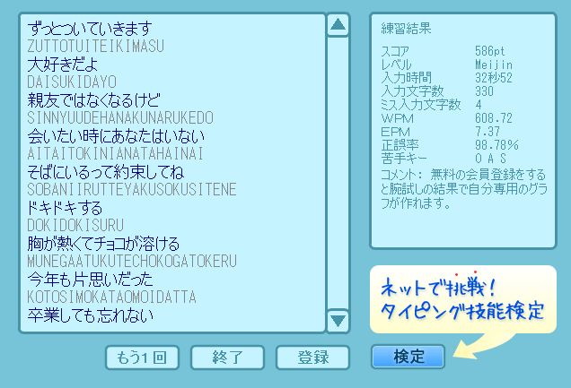 ついにやってきましたバレンタイン。 そう、ばれんたいんといえばコレです!! e-typingバレンタインワード(*>v<*)ノ WPM608.72+miss4→スコア586ptということで、 1年以上の沈黙を破ってエタイ自己ベスト更新となりました! やってないんだからそりゃ更新できるわけないんですけど>< 去年1月の元気ワード573(WPM588.6/miss3)から13ptのあっぷです。 お約束で最後の文で緊張しまくって、減速+2ミスほど増えたのが悲しすぎますorz 今週のワードで、初の(だったはず…)WPM600overを2回いただきました。 なんて素敵なワードなんだ! 1年に1回じゃ足りませんよ。もっと愛をください>< ブログ書いてる時点でまだ残り2日ありますが、 更新できる自信も指力もございませんっ。 4人ふるこんすこあ記録