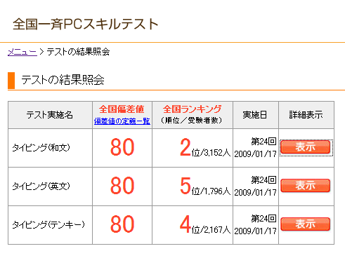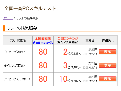 11月の記事ゼロとはすばらしいっ。 忙しいっちゃ忙しい今日この頃ではありますが、 それよりブログ更新意欲がゼロだったというのが更新停滞の理由デス>< ネタは無きにしもあらずだったのですが・・・。(新曲とか新曲とかちびすけとか) そんな私ですが、今から12月分のはたらこをやりに行こうと思っておりまして、 その前に11月分の結果でも貼っとくかね!というわけで久々に参上いたしました。 なんというひどい理由! そんなわけで、はたらこねっと全国一斉PCスキルテストをやってみました第12弾をぺたり。 和文