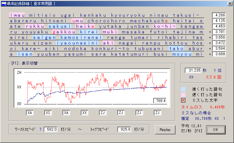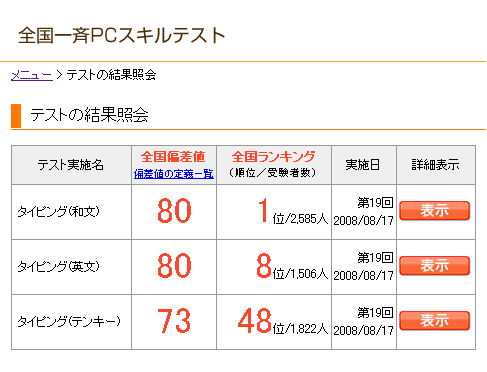 和文で初1位きたあ! ・・・どうみても某ごにょごにょさまが受けてなかっただけです、本当に(ry そして辞書学習ぱわーです本当に/(^o^)\ というかコレ受けてるタイパー?さまを3人しか知らないわけですが>< いや、4? 皆様やるべきだと思います。やりましょう!(? やってみようと思ってるのについ実施期間を逃しちゃう!というあなたには、 漏れなくぺこあらーむがついてくる・・・かも? さて、今回は前回宣言したとおりミス直さない作戦でいってみました。 直さないといっても和文の場合は確定(Enter)前は普通に直す気でいたのですが・・・ 何故か終盤までタイプミスゼロ!ktkr! 勢いにのって最後の方はろくに見直さずに即Space→即Enterしてたら、 ちょっとしたタイプミスが周囲一帯をカオス変換に導いてくださいましたよ>< もちろん修正はせず。7ミスはそこだと信じきっております。 (都合の良いミソなので実際どーだったかは知りませんが) TWとかみたいな全力打ちではないとはいえ、かなり頑張ったんじゃないかな!? 前回の考察から見ても、恐らくこれくらいが今の私の限界値に近そうです。 英文は・・・すごく・・・コメントしづらいです(終 テンキーはかなーりひどかった>< ここのところ思いっきりTW数字をサボっていたのがはっきり結果に表れてしまいました。 全然キーの位置が浮かばなくて涙目! 数字はずっと役に立つ(ハズな)のでちゃんと練習続けようと思いました。 偏差値80はキープしたいよ! それにしても謎の表も随分横長くなってきたものです。 来月でちょうど1年だし、本当にグラフ化でもしてみようかしらん? |