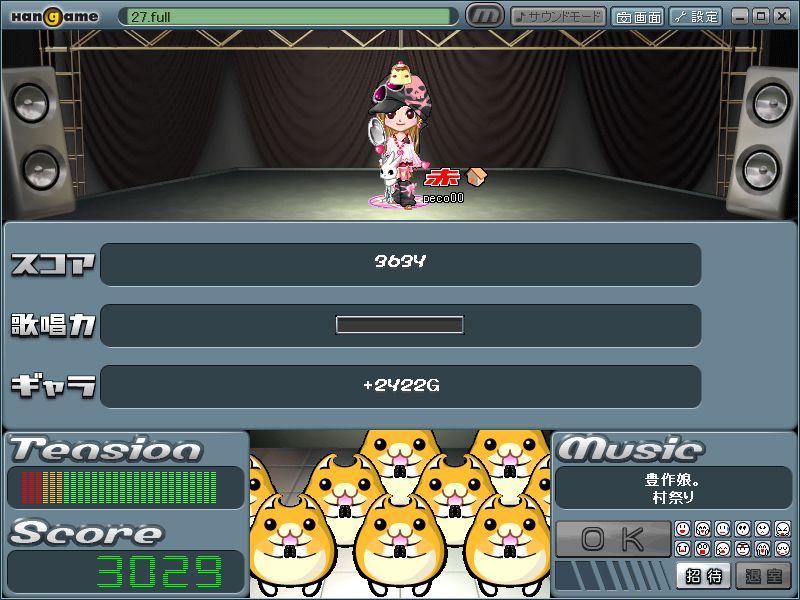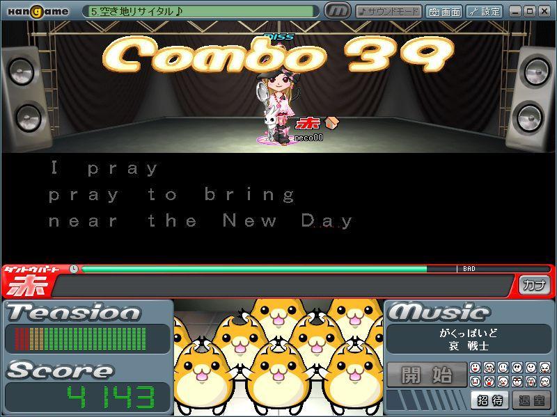 全く知りませんがガンダムの曲だそうです。 が・・・ 歌詞なし初見でもソロフル。(スコア3343) 難易度2ということで非常にやりがいのない曲に仕上がっておりました>< とりあえず何度かやってこんな感じに。 哀 戦士(qweのみ) 英語はしょぼったけど他はそれなりだったような? 4人でもさっくりフルコンさせていただきました。ありがとうございますっ これだけじゃなんなので、おまけ。 すでにだいぶ前の話になりますが、 いまさらうさだんと村祭りソロフルに成功いたしました! うさだん(混合) 4941×上級×アイテムで6521。 自己ベストスコアは5832(b1o1)なのでだいぶしょぼってます>< スコアに納得いかなくてこれ以降も何度もやってるのですが、 いまだにこの1回しかフルできておりません(´;ω;`)ぅ… 村祭り(qweのみ) 3029×上級で3634。 4人コンボ時、しらぬ間にhyararaを最適化して打ってたので、 なんとなくソロでやってみたら普通に打ち切れてしまいました。 最近いろいろ無意識で最適化してることが多いです。 わすれてないよ