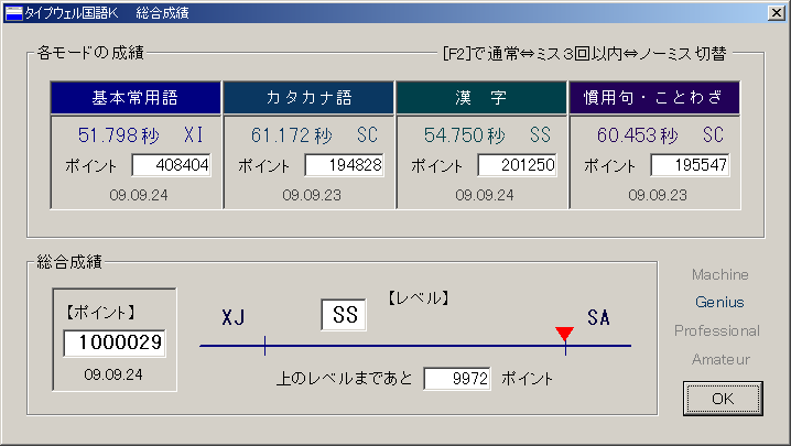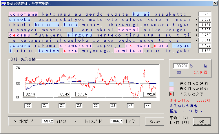 タイトルでqweの大幅更新を期待した方ごめんなさい!? 実はわたくし、先月26日からひそひそとJISかなをやっておりました。 昔少しかじっていたので、0からのスタートではなく2からのスタート!?くらいですが。 (初回?のTWK常用はGでした) 練習内容はTW、WT、歌謡、モーモーさんの打鍵トレ、チャットのJIS化(でも5割くらい)。 ちなみにきっかけは歌謡のためではありませんヾ(*´・∀・`*)ノ そんなこんなで本格練習開始から今日で1ヶ月。 微妙に日付が古いですが、強引に総合SSに突入しましたヽ(^ω^)ノ★ミ 本当は1ヶ月で総合X入りを目標にしてたのですが、気合い不足でした(´・ω・) 練習回数は常用500回、カタカナ110回、漢字140回、慣用句150回(およそ)。 Esc押さずにだらだら打ってたりもしたので、私にしては多めです。 現状としては、 ・どの項目もミス平均が50超え ・右シフトが打てない ・いまだに運指がめちゃくちゃ → だから指がとっても痛い\(^o^)/ 本当は美佳カナで運指覚えから始めるつもりだったのに、 ATOKだと何故か打てなくてその過程をふっとばしたんですよね(つω∩) その上中途半端にキーの位置を覚えていたので、基本は「無理矢理ブラインドタッチ」。 (この辺だったかな?っていうあたりをその近くにある指で適当に打ってみる) その結果がこれだよっ! 今後は速度よりもこの辺の修正を重視して練習していきたいです(´・ω・`) 参考までに9/26現在の運指。 こうして見ると意外と普通!?(ほ、本当か??) qweでは右薬&小指をほとんど使ってないので、 JISでももう少し中指を右側に進出させたいです。(わ・ら・り辺り) 今のところ右薬・小なんかより左人・中が痛いんですけどね… それにしても「お」が本来右人差しで打つものだったなんて今はじめて知りました/(^o^)\ 左人差しが痛い原因の1つなのかッ!? とは言っても右人差しはちと届きそうにないので左のままいくことになりそうです(´・ω・) 歌謡はJIS専用IDを作ってちょいちょいやってます。 (自分としては中身分かりやすいIDにしたつもりが、意外と分かりづらいらしい?) 一番やりこんでるのがポリリズムで、3日前にようやくソロフルできました! 現最高スコアは6123。 更新がかかるとラストパフェ逃すのはデフォルトですよね(*´ェ`*)… 各所かなり詰まりまくってますが、 「くりかえす」と「ぽりりずむ」が断然JISの方が速いので 私がqweのみでやるよりもスコア高いと思います。(恐らく混合が一番高い) そういえば今更ですけど歌謡の曲だいぶ減りまくりましたね>< 春・かもめ・かたつむり・虫あたり、私の中では完全にJIS曲だったのでタイミング悪すぎでした。 歌謡はタイピング練習にならないってよく言いますが、 今回のJIS練習は歌謡なしでは1ヶ月続いてなかったと思います。 TWとかWTとか、一人で黙々と打つ練習は本当に辛いです●凹 →9/26 22時半、Lv4達成しました(*>ω<*)ノ♪ モチベがかなり不安定ですが、なんとか3ヶ月くらいは続けたいですね! 練習に良さそうなソフト(なるべく楽しいモノ)などあれば是非教えてくださいまし! <おまけ> JIS練の息抜きにR常用打ったら何故か更新できました(;^ω^) 30.765[XX] → 30.328[XX] → 30.281[XX] JIS練よりこっちをとっととZにしようよ(つд∩) |