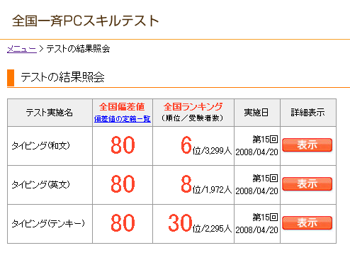 和文変なとこでちょータイムロスしたのに(期毎とか!)何故かのびました。 あと10文字はいけた!? 英文の2ミスは途中で放棄した単語1つと最後の打ちかけ単語1つかなー。 今回は打ちにくい(というか長くて打ちたくない)単語が多すぎました。 テンキーは慎重に打ってみたら一応更新しましたが・・・ 色んな意味で納得できません>< あんだけ慎重に打って10ミスもしてたらクビですよ!(なぞ 問題文って月毎に全員共通なのかなぁ。 やすみはだいじだよ