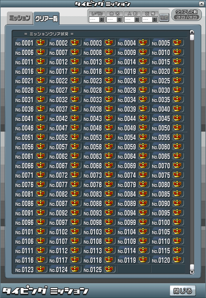ついに・・・ タイピングミッションをフルコンプリートさせていただいてしまいました! またも合成ですが、なかなか気持ち悪い画像です>< 最後までしぶとく生き残っていたNo.0079 ロンドンフルコン15回ミッションですが、 本日2回分フルさせていただき無事ミッション完遂! ここまで手を貸してくださった皆々様、本っ当にありがとうございました!! またミッション増えた際には頑張りたい…とは思いますが、 ちびすけフルコン×15だけは勘弁していただきたいです。 Q.フルコンプしたら何か起こりましたか? A.してからのお楽しみですΩ\ζ°) フルコンプし終えたら全ミッション出現条件をうpしようという目論みだったのですが、 どうしてもNo.101~104(雪ゾーン)の出現条件だけ不明です。 ちょっと自分だけでは突き止められそうにないので、ひとまずそこ以外を公開予定です。 逆にそこ以外は完璧・・・のつもり! まとめるの時間かかりそうなのでまた後日うpいたします。 PR ぎりぎりばれんたいん